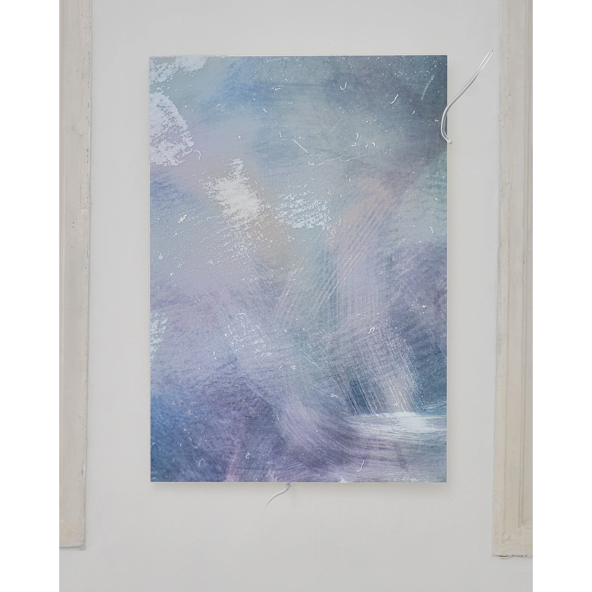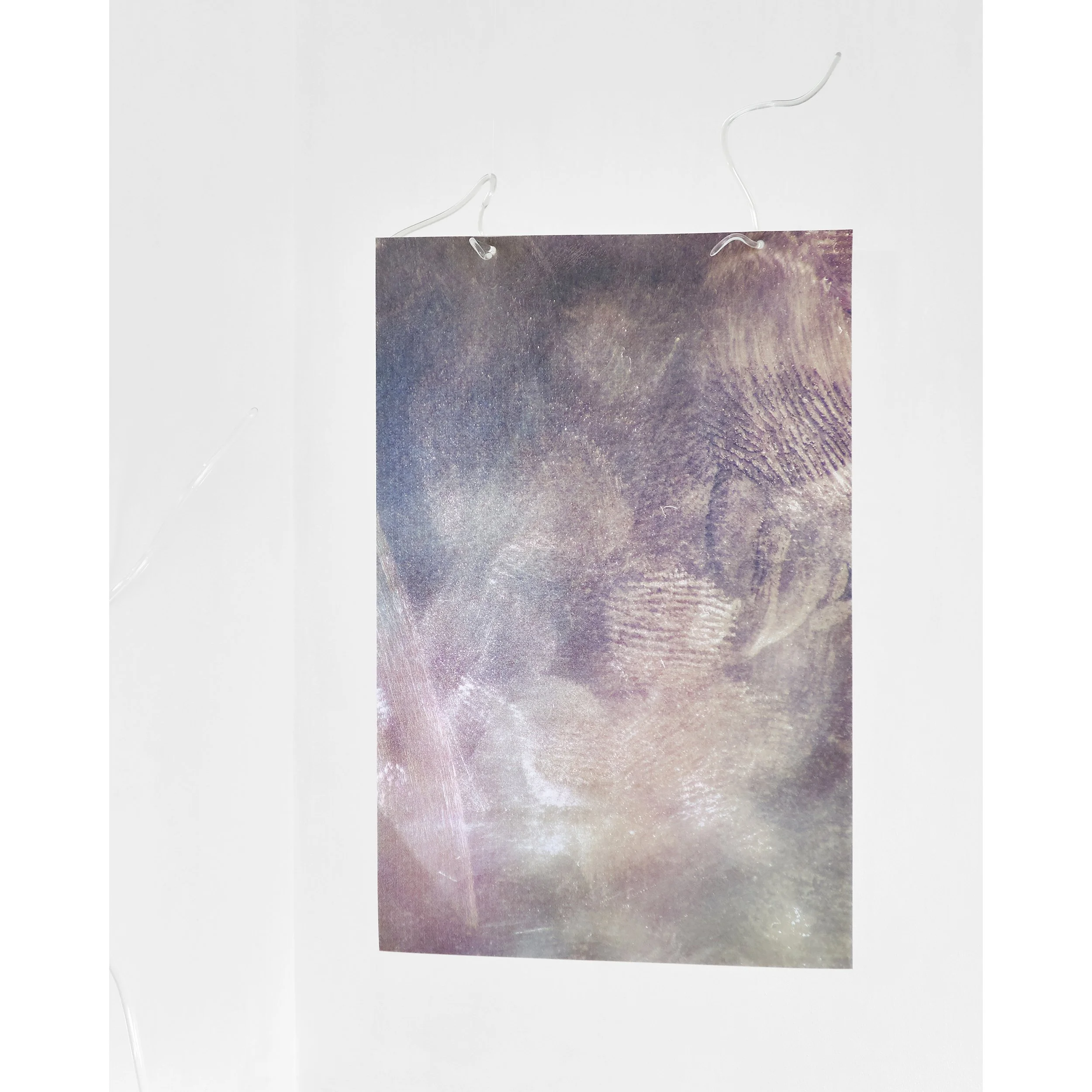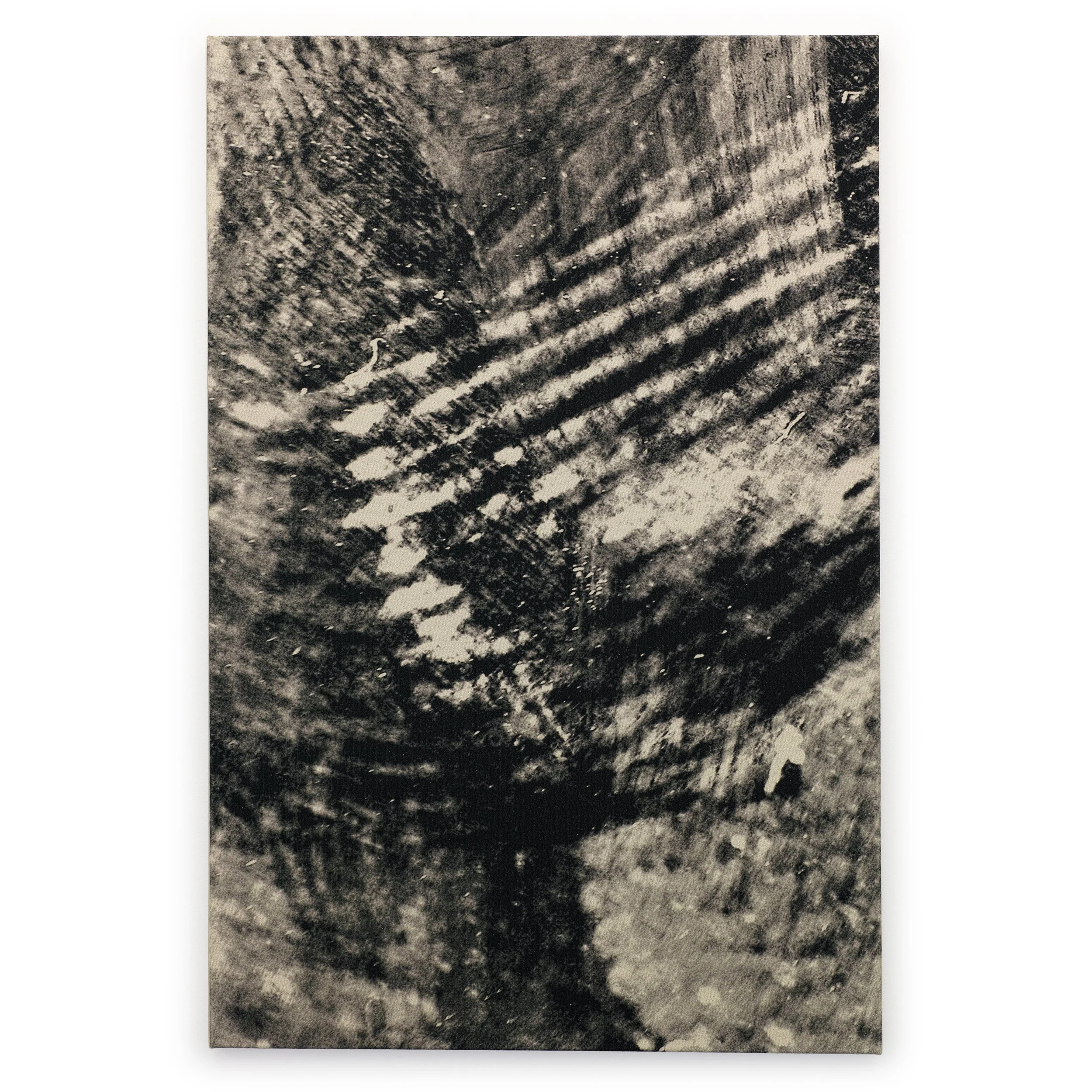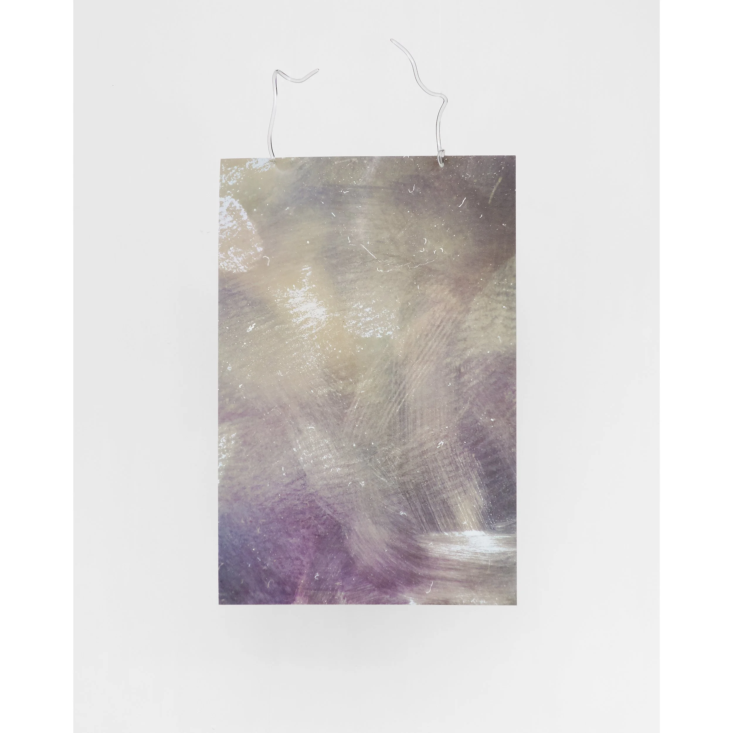 Painted steel, glass panel with residue print, silicone photo transfer monoprint.