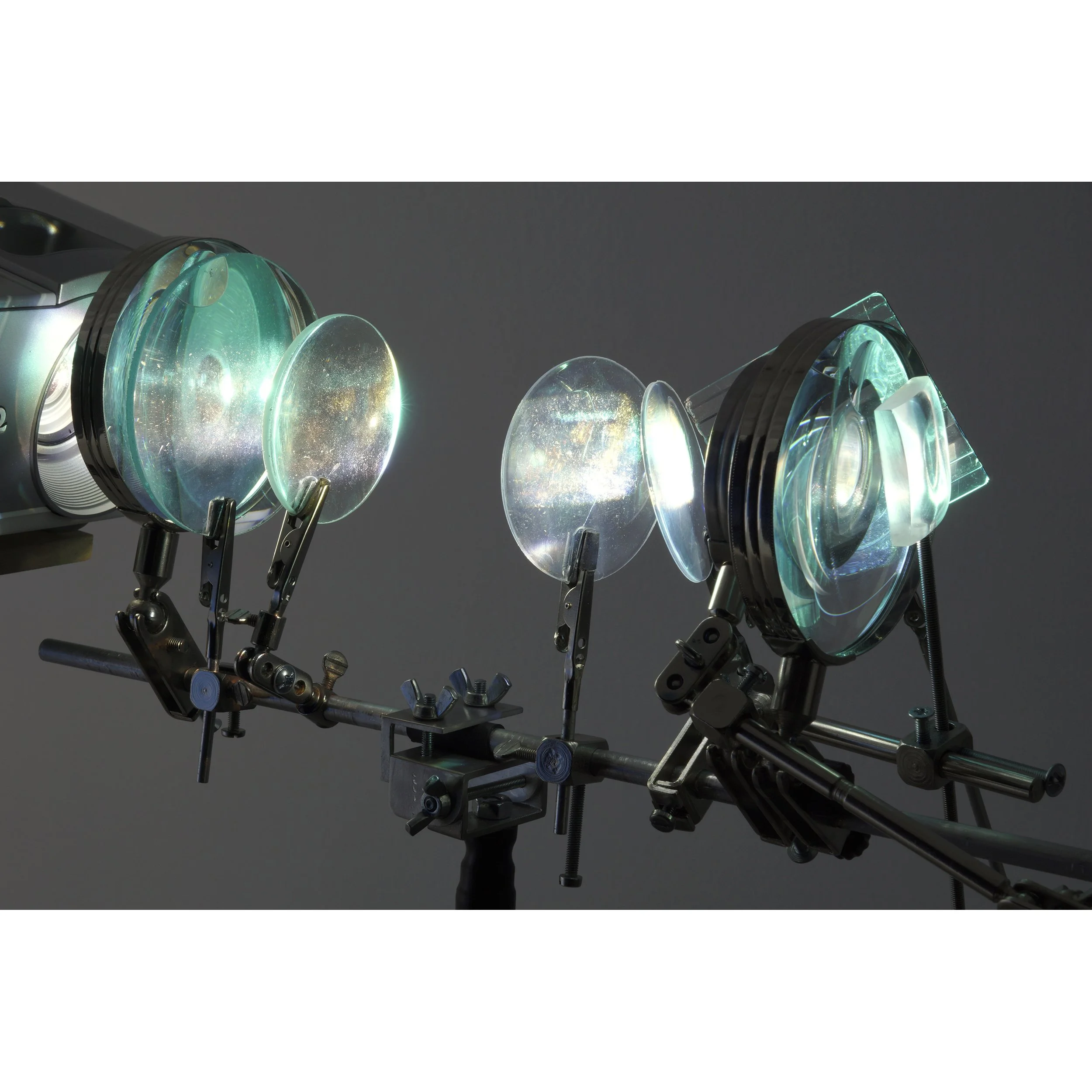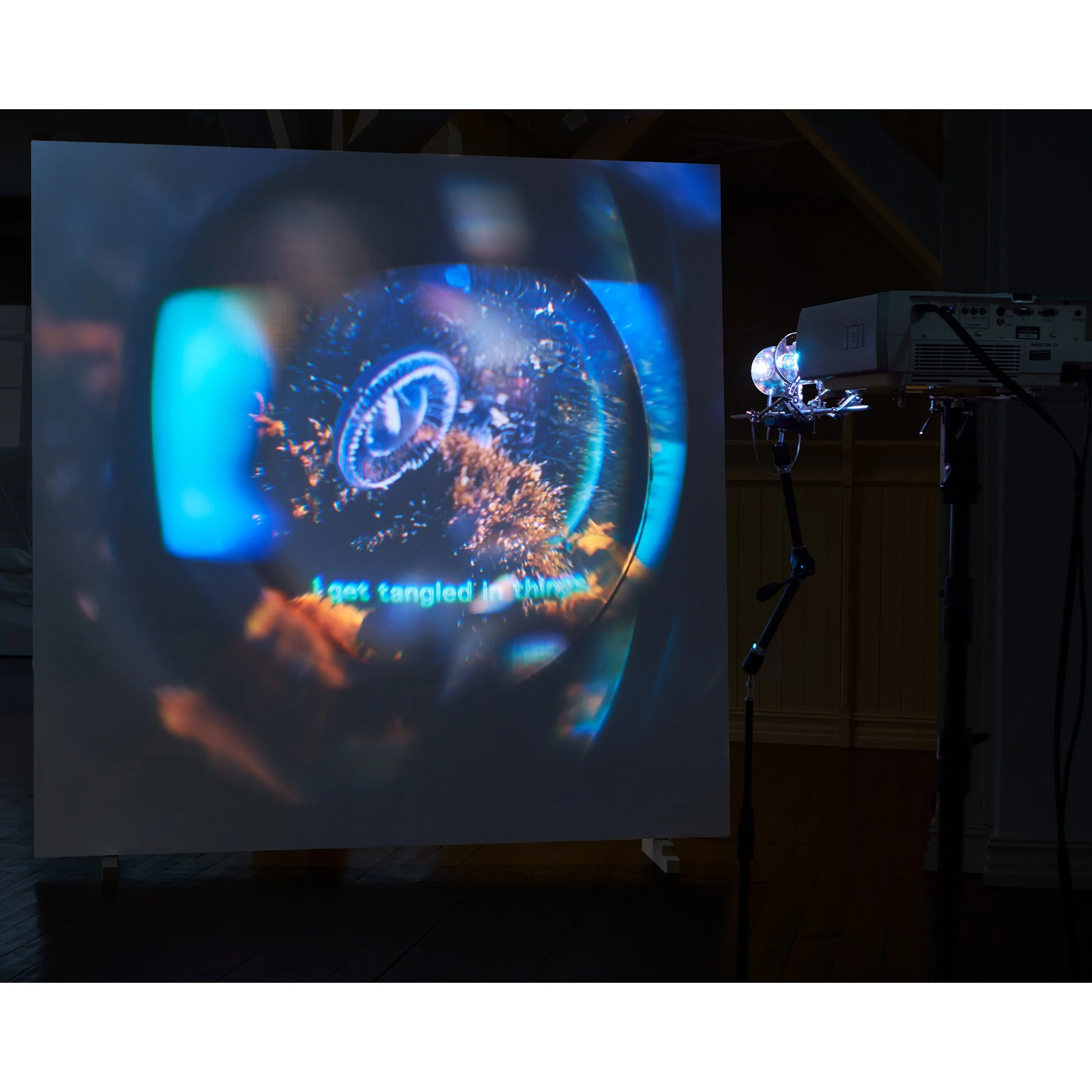 Video/sculptural installation of variable dimensions. 05:18 min video, tripods, unfocused projector, media player, AV cables, aluminum, steel, glass and plastic lenses, wood, drywall, paint.