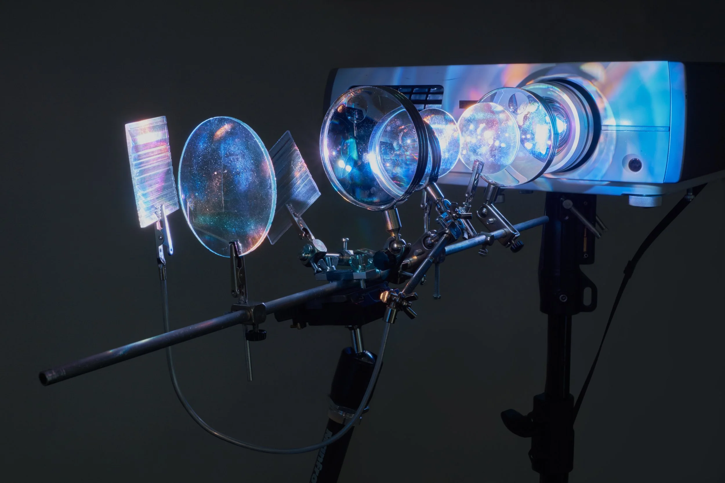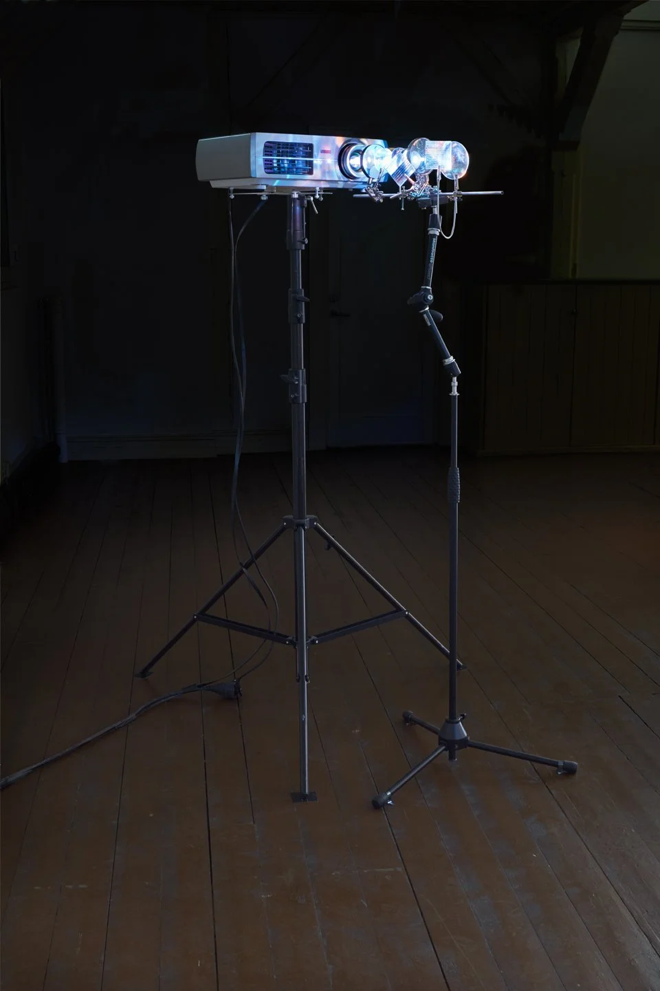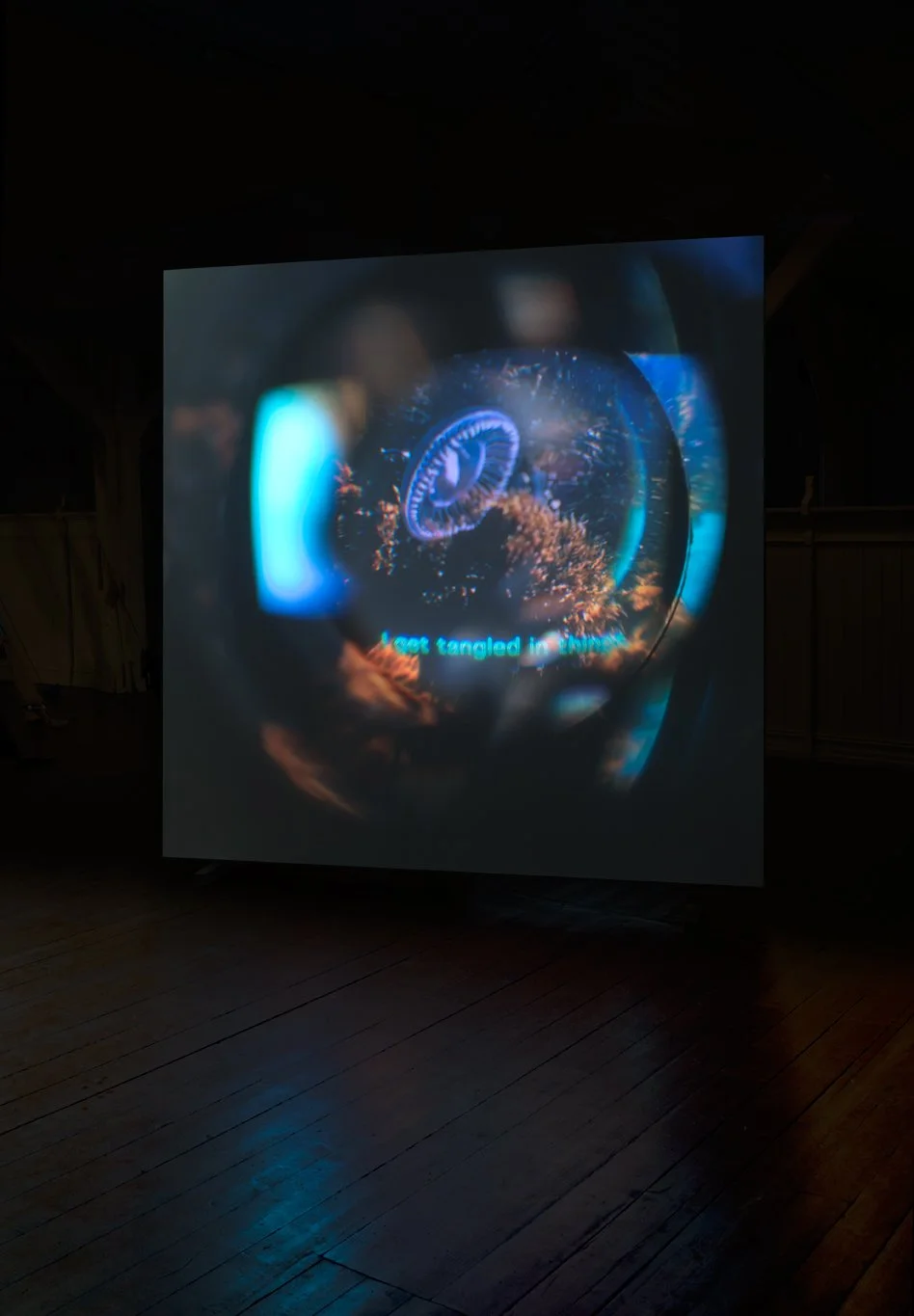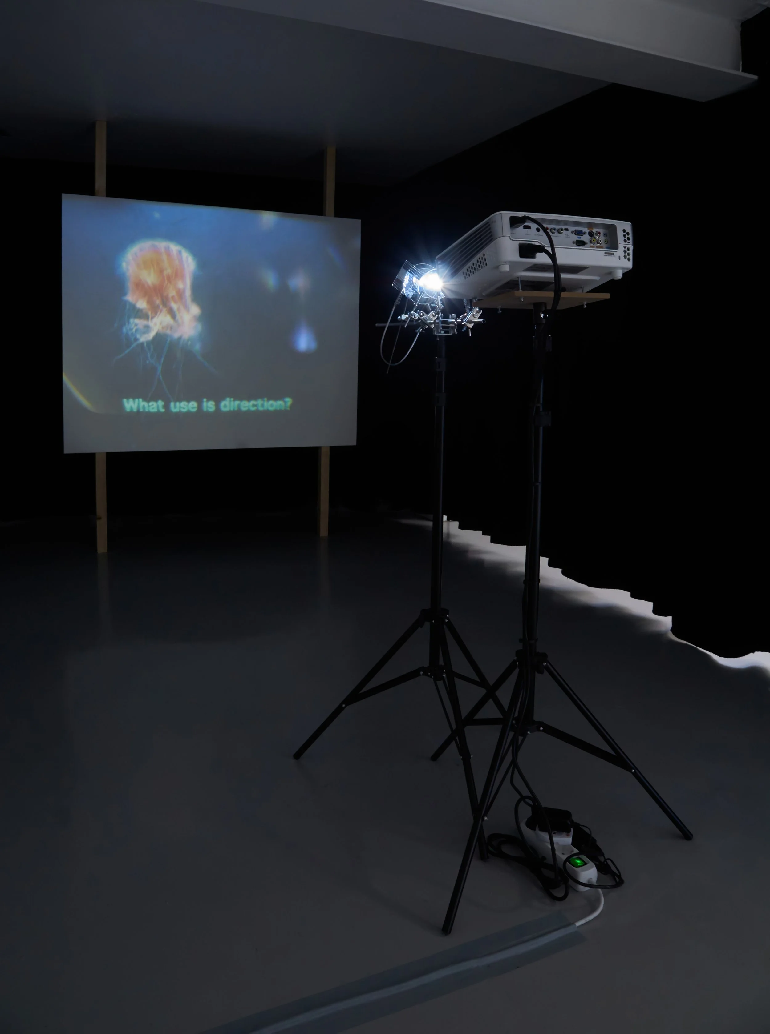 I recalibrated an out-of-focus projector by hand using various glass and plastic elements. My intention was to reveal the historical perspective of imaging technology as an active participant in constructing the world, and to question optical notions of clarity. While thinking about this process I filmed jellyfish underwater. I combined that footage with a meandering sequence of subtitles and the resulting video is then projected through the complex installation of lenses. The subtitles are my own thoughts, but they could be misinterpreted as those of a jellyfish. "What use is direction? / I move only ever outwards / from a space / a form / a time / to another." The oldest multi-organ species on the planet, jellies are prospering in the warming oceans. Perhaps the jellyfish is a excellent metaphorical figure for our time, a successful symbol for undefined knowledge in the Anthropocene.
